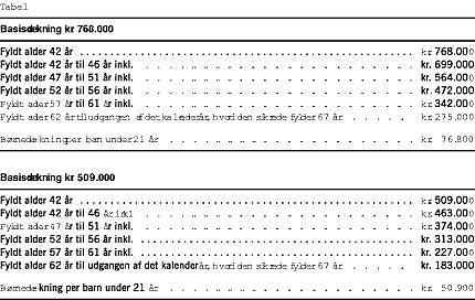 Alle deltagere er ved død inden udgangen af det kalenderår, hvori de fylder 70 år, sikret samme sum, kr. 316.200. Børnedækningen per barn under 21 år udgør kr. 31.620