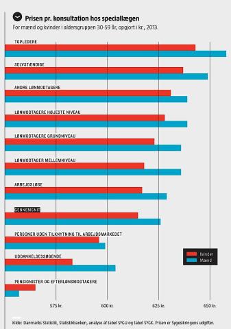 Som grafen viser, får topledere bedre – eller i det mindste dyrere – behandling hos speciallæger end f.eks. pensionister, og højtuddannede bliver sjældnere genindlagt efter hospitalsindgreb end lavtuddannede. En del – måske endda en stor del – kan forklares ved livsstil og samfundsskabte forhold, men kunne det kanske, måske, eventuelt også skyldes skævheder i selve behandlersystemet?