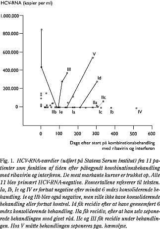 II: Tre var tidligere narkomaner (30, 45 og 55 år) med betydelig leverpåvirkning med ASAT-værdier på 200-300 U/l (normalt under 50 U/l). De blev alle tre HCV-RNA-negative på få måneder, samtidig med at ASAT normaliseredes. Det var dog kun en, der herefter accepterede konsoliderende behandling i et halvt år, mens de andre to ikke mødte op, efter at de havde fået at vide, at virus ikke længere kunne detekteres. Hos den ene, som accepterede konsoliderende behandling, var blodet virusnegativt i 4 mdr., men efter 5 mdr. blev han atter HCV-RNA-positiv på trods af fortsat kombinationsbehandling.