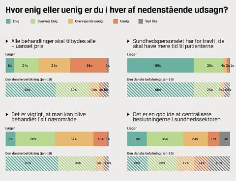 På de to punkter er lægerne og befolkningen rørende enige. Godt halvdelen af lægerne og knap halvdelen af befolkningen mener, at sundhedssektoren skal centraliseres. Over 90 procent af både lægerne og befolkningen mener, at sundhedspersonale har for travlt.