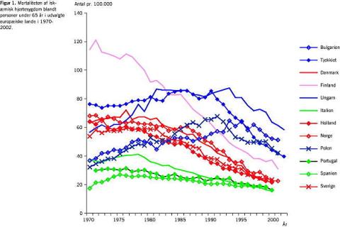 Figur 1 viser mortaliteten af iskæmisk hjertesygdom siden 1970 for udvalgte europæiske lande (http://www.who.dk/ hfadb). Figuren omfatter kun mortaliteten for befolkningen under 65 år. Mortaliteten er faldet i alle europæiske lande, men udviklingen har været forskellig. De nederste grønne kurver (Portugal, Spanien og Italien) viser den udvikling, som er typisk for de sydeuropæiske lande med en lav mortalitet i hele perioden og et tydeligt fald i mortaliteten især i Italien. De midterste røde kurver viser udviklingen i Danmark, Norge, Sverige og Holland. Mortaliteten var i 1970 mere end dobbelt så høj som i Sydeuropa, men er blevet halveret og nærmer sig det sydeuro pæiske niveau. Finland har haft en særlig markant udvikling, idet mortaliteten omkring 2000 var reduceret til en tredjedel af niveauet i 1970. Den tredje gruppe lande (blå kurver) er de østeuropæiske lande (Polen, Bulgarien, Tjekkiet og Ungarn), som havde en stigende mortalitet af iskæmisk hjertesygdom frem til første halvdel af 1990'erne med et efterfølgende fald. Niveauet er dog væsentligt højere end i de øvrige lande.