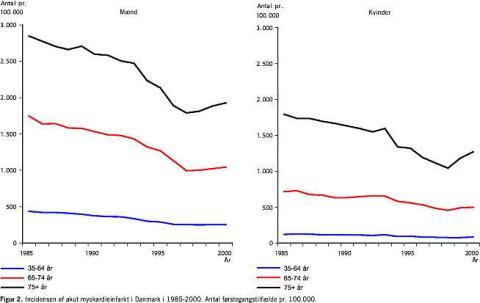 Den faldende mortalitet kan dels skyldes et fald i nye sygdomstilfælde (incidensen) og dels en forbedret overlevelse blandt de personer, der har fået sygdommen. Incidensen af iskæmisk hjertesygdom er som nævnt vanskelig at måle, men som indikator kan anvendes incidensen af AMI. Figur 2 viser udviklingen i incidensen af AMI siden 1985. Tallene omfatter dels personer indlagt med AMI og dels AMI-dødsfald uden for sygehuset. Der ses et klart fald i incidensen for både mænd og kvinder og i alle aldersklasser. Fra 1990 til 1998 faldt incidensen med i gennemsnit 5% om året for både mænd og kvinder. I 1999 og 2000 ses en stigning i incidensen, især blandt de ældste.