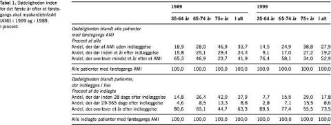 Tabel 1 viser dødeligheden det første år efter et førstegangs AMI i 1999 og 1989. I 1999 døde lidt mere end hver fjerde, der blev ramt af et AMI, før de nåede at blive indlagt, hver femte døde inden et år efter en indlæggelse, og godt halvdelen overlevede et år. Blandt de yngste patienter overlevede næsten tre fjerdedele og blandt de ældste patienter overlevede en tredjedel. Dødeligheden er beregnet i procent af alle AMI-tilfælde, inklusive pludselige dødsfald uden for sygehuset. Hvis dødeligheden alene beregnes i forhold til patienter, der indlægges i live, var dødeligheden i de første 28 dage efter indlæggelse med AMI faldet fra 28% i 1989 til 18% i 1999. I den yngste aldersklasse var dødeligheden faldet fra 14,8% til 7,7% og for de 75+-årige fra 42% til 29%. Dødeligheden 29-365 dage efter indlæggelse var derimod næsten uændret.