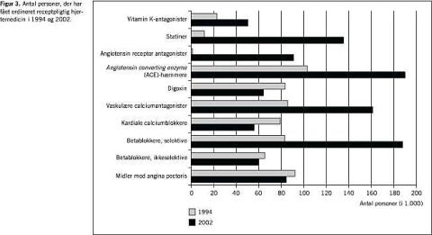 Figur 3 viser udviklingen i den ordinerede receptpligtige medicin siden 1994 for udvalgte præparater [7, 8]. Udviklingen har været særlig markant for den forebyggende medicinske behandling, hvor forbruget af statiner er tidoblet, og for behandling af hypertension, hvor forbruget af angiotensin converting enzyme (ACE)-hæmmere, vaskulære calciumantagonister og selektive betablokkere er mere end fordoblet samtidig med, at angiotensin-receptor-antagonister, som i 1994 kun brugtes til ganske få patienter, nu er blandt de hyppigst anvendte præparater. Anvendelsen af midler mod angina pectoris (langsomtvirkende og hurtigtvirkende nitroglycerin) er faldet en smule.
