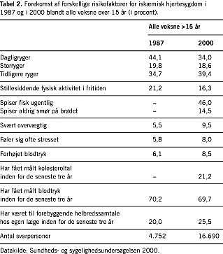 Den faldende mortalitet af iskæmisk hjertesygdom synes således både at kunne tilskrives en lavere forekomst af nye sygdomstilfælde og en forbedret overlevelse blandt dem, der rammes af sygdom. I det følgende belyses, om der tilsvarende ses en forbedring i de kendte risikofaktorer for hjertesygdom, som kan have medvirket til den lavere incidens, og om der er sket en udvikling i behandlingen, som kan forklare den bedre overlevelse.