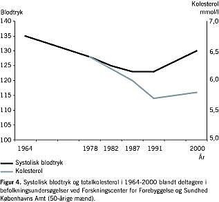 Tabel 2 viser udviklingen i en række risikofaktorer for hjertesygdom fra 1987 til 2000. Udviklingen er ikke entydig. For nogle risikofaktorer er der sket en positiv udvikling, men for andre er udviklingen negativ. Andelen af dagligrygere er faldet fra 44% til 34%, andelen af storrygere er ligeledes faldet, men faldet er her meget beskedent. Tilsvarende er andelen af tidligere rygere steget. Andelen med stillesiddende fritidsaktiviteter er faldet, mens andelen af svært overvægtige er steget markant. Andelen, der ofte føler sig stresset, er ligeledes steget. Type 2-diabetes er en markant risikofaktor for hjerte-kar-sygdomme. Fra 1976 til 2000 er der sket en fordobling i antallet af personer med type 2-diabetes [9], hvor stigningen synes at være særlig markant gennem de seneste få år. Desuden viser data fra FCFS (Figur 4 ) et fald i både kolesteroltal og systolisk blodtryk hos 50-årige mænd fra 1964 og frem til 1991 efterfulgt af en stigning i 2000. Stigningen i det systoliske blodtryk er i overensstemmelse de selvrapporterede data fra SUSY-undersøgelsen, hvor andelen, der angav at have forhøjet blodtryk, er øget fra 6,1% i 1987 til 8,1% i 2000.