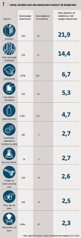 I de ti brancher opført i tabellen har Arbejdstilsynet givet flest forbud, påbud og andre afgørelser om overtrædelser af arbejdsmiljøreglerne om indeklima i 2012, set i forhold til hvor mange virksomheder, der har fået besøg.