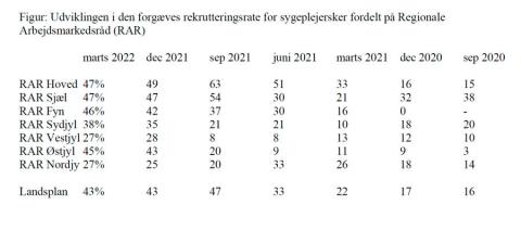 Fra kvartalsrapporterne for september 2020 til marts 2022 er der sket en tredobling af forgæves rekrutteringer af sygeplejersker på landsplan. Raten ligger i dag på 43 procent mod 16 procent for under to år siden.