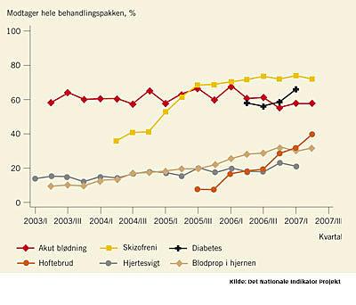 Her kan man f.eks. se, at rigtig mange - ca. 90 pct. - diabetespatienter får elementer af den anbefalede behandlingspakke, og at tallet er stigende. Men stadigvæk er det med denne opgørelsesmåde f.eks. kun lidt over 70 pct. af patienterne med blodprop i hjernen, som får nogle af de undersøgelser og behandlinger, som udgør det optimale behandlingsforløb.