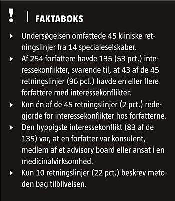 Fra juli 2010 til marts 2012 udsendte 14 danske specialeselskaber 45 kliniske retningslinjer, hvor 87 pct. af forfatterne – ved nærmere eftersyn – viste sig at have interessekonflikter i forhold til medicinalfirmaer. I mange tilfælde blev det bare ikke oplyst.