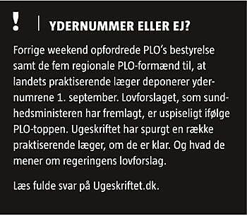 »Ja, jeg er parat til at aflevere mit ydrenummer. Velvidende at jeg ikke er sikret at få det igen, og at jeg står med en milliongæld. Når jeg læser regeringens lovforslag bliver jeg bekymret for min og mine kollegaers arbejdsforhold og manglende indflydelse på hvad, hvornår og hvordan vi skal varetage de opgaver, som regionerne finder relevant, men mindst lige så bekymret for vores patienter. Jeg er almenmediciner - en dygtig generalist. Jeg kan kun læse lovforslaget som en kla r forringelse af den velkvalificerede behandling, jeg og min 3.600 kollegaer leverer hver dag«.