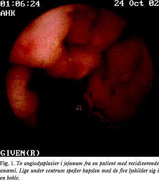 Den vigtigste indikation er gastrointestinal blødning, hvor gastroskopi, koloskopi og røntgen af tyndtarmen ikke har afsløret blødningskilden. Gentagelse af koloskopi og gastroskopi må overvejes, da erfaringen er, at blødningskilder i disse tilfælde ikke sjældent er overset og alligevel findes inden for rækkevidden af de traditionelle undersøgelser. I de foreliggende opgørelser er angiodysplasi et hyppigt kapselendoskopisk fund (Fig. 1 ), men om det har betydning som den aktuelle blødningskilde, kan ofte være svært at afgøre, og dermed også om patienten kan helbredes som en konsekvens af undersøgelsen. De øvrige fund har været forholdsvis sjældne tyndtarmssygdomme såsom lymfomer, adenokarcinomer og polypper.