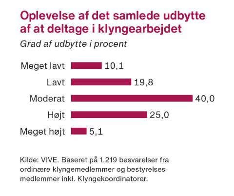 Hvornår er glasset halvt fuldt – og hvornår er det halvt tomt? Det spørgsmål presser sig på, når man skal uddrage konklusioner fra evalueringen af klyngearbejdet. For 30 procent af lægerne svarer, at de har fået et højt eller meget højt udbytte af arbejdet, mens 30 procent svarer, at deres udbytte er lavt eller meget lavt. De resterende lægger sig midt imellem med svaret »moderat«.