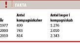 Men også det er ved at ændre sig: Fra 1977 til 2010 er andelen af kvinder øget fra 10 procent til 40 procent. På de 33 år, undersøgelsen dækker, er antallet af praksis steget fra 1.835 til 2.082. I 1977 var 27 procent af dem et kompagniskab. Den andel er i dag 39 procent.
