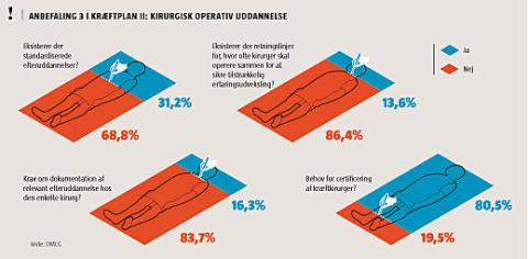 DMCG's undersøgelse graver anbefalingerne fra Kræftplan II frem for at finde ud af, om de er gennemført. En anbefaling siger, at kræftkirurger skal dokumentere relevant efteruddannelse. Men kun omkring en tredjedel af afdelingerne kræver det, viser undersøgelsen. To ud af tre afdelinger har ikke en standardiseret efteruddannelse og stiller heller ikke krav om, at kirurgerne skal dokumentere gennemført efteruddannelse (se også boks).