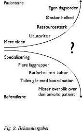 Med udgangspunkt i eget sygdomsforløb og -oplevelse fastslog Erik Rasmussen, at patientens dagsorden har en stor kompleksitet, hvoraf selve sygdommen kun udgør en lille del. Hvis patienten skal være en ressourse i behandlingen og sygdomsforløbet, skal man forstå patientens kompleksitet. Hvis man ikke gør det, vil man komme til at opleve, at »behandlergabet« vokser og vokser (Fig. 2 ).