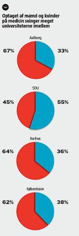 Andelen af mænd stiger svagt på lægestudiet. I år er 38,5% af de optagne på medicin mænd, mens tallet var 35,8% i 2011. Forklaringen er især, at flere mænd bliver optaget på Syddansk Universitet, der som eneste studiested har kvote 2 til medicinstudiet. Her udgør mændene over halvdelen af de optagne.
