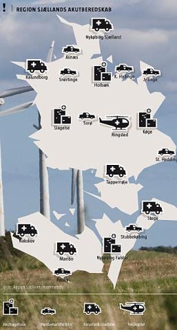 Noget helt andet er de betragtelige afstande i regionen. Der er normalt otte lægevagtbiler til rådighed, mens der om natten - dvs. mellem midnat og kl. 8.00 om morgenen - er fire. De skal dække en region på 7.273 km2. Det svarer altså ca. til 900 km2 pr. bil.