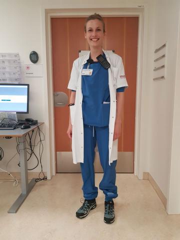 »Jeg tænker ikke, at det kan være meget anderledes, når man arbejder på et stort hospital, derfor er der også cykler og løbehjul, for nogle gange skal man jo kunne nå rigtigt hurtigt frem. Det er bare sådan, det er. Det at være læge og især have vagt, er at være på benene. Men man kan godt blive træt i stængerne og fødderne«.