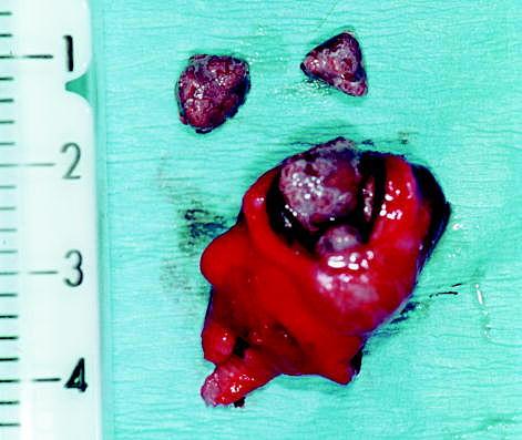 Ved den efterfølgende operation blev der fjernet en sækformet struktur på 3¥2 cm indeholdende syv gråbrune sten. Stenene er formentlig påført sammen med lerjorden i forsøg på at mindske den peroperative blødning i forbindelse med en rituel omskæring 24 år tidligere (Fig. 1 ).