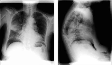 Klinisk var patienten smertepåvirket, let febril (med en temperatur på 37,8º C) og med stetoskopisk udtalt krepitation på hø. bag- og sideflade. Abdomen var øm, blød, meteoristisk og med normale tarmlyde. Biokemisk fandtes et leukocyttal på 17 mio./l og CRP på 400 mg/l (normalområde <10 mg/l). Røntgen af thorax viste som ventet et stort højresidigt infiltrat, men desuden en anden akut behandlingskrævende tilstand: luft under begge diafragmakupler. Patienten blev samme dag opereret for perforeret ulcus ventriculi.