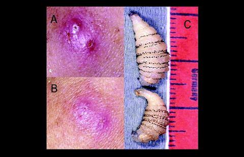 Dermatobia hominis overfører sine æg med et stikkende insekt som mellemvært. Larven er ofte vanskelig at eksprimere fra huden, da den har »modhager« på overfladen (C). Der kan derfor være behov for kirurgisk excision, men okklusionsbehandling kan ofte tvinge larven frem som i dette tilfælde.