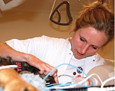 12.45 Vi har arbejdet på protokoller hele formiddagen. Og sms'et med hundeejeren, som nu ankommer med Emma - en stor, ni år gammel hund af blandet race. Emma er en lidt forsigtig hund, men hun er kommet her en del gange og har også været med inde til skanninger på Rigshospitalet. Hun er blevet tryg ved os og er glad og logrende. Jeg får hende »indlagt« og anbragt i den vante boks.