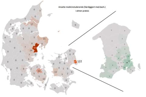 Men der er grænser for, hvor lang tid studerende vil bruge på at komme til deres studiejob, og det afspejler sig da også i PLO’s opgørelse over den geografiske fordeling af de medicinstuderende i almen praksis. Langt hovedparten arbejder i universitetsbyerne eller i omegnskommunerne, enkelte rejser længere væk til byer som Hillerød og Hedensted.