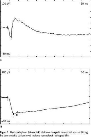 På Statens Øjenklinik blev der foretaget elektroretinografi (ERG), som viste en for MAR karakteristisk konfiguration. Der var næsten ophævet b-bølge og bevaret a-bølge i stavsvaret (Figur 1 ).
