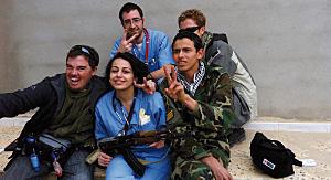 14.15 Vi beslutter at gå en tur rundt i byen og går til oprørernes Media Center, hvor journalisterne holder til, og hvor der altid demonstreres. Det er det eneste sted i Østlibyen med internet. Vi ser grupper af militsfolk med antiluftskyts og folk, der gør klar til kamp. Langt ude på vandet ligger et krigsskib fra Gaddafis flåde. Mens verden fortsat diskuterer en flyforbuds-zone, hører vi flere sige, at »vi skal ikke regne med international støtte. Skal vi dø, er det dét«. Vi snakker med folk og optager video med en dansk journalist, vi mødte på Media Center.
