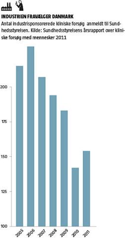 Generelt er antallet af industrisponsorerede kliniske lægemiddelforsøg herhjemme raslet ned med 29 pct. i perioden 2005-2011, viser tal fra Sundhedsstyrelsen, se graf på denne side.