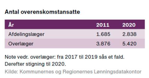 I marts 2011 var der 1.685 overenskomstansatte afdelingslæger. I december 2020 var der 2.838. Det er en stigning på 68 procent. I samme periode steg antallet af overenskomstansatte overlæger fra 3.876 til 5.420, en stigning på 40 procent.