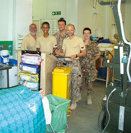 På fotoet, som er fra felthospitalets skadestue, ses fra venstre: overlæge Peter A. Christensen, 1. reservelæge Kariatta Karoma, 1. reservelæge Henrik Thorup, oversygeplejerske Claus Bakke og overlæge Therese Pulawska.