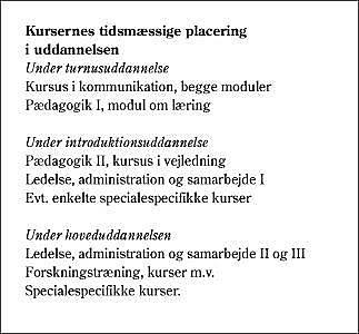 Videreuddannelsen kommer fremover til at foregå i tre afsnit: turnusuddannelse i 18 måneder, introduktionsuddannelse i 12 måneder og hoveduddannelse i 48-60 måneder, dog for de intern medicinske og kirurgiske specialer op til 72 måneder. I disse forløb indgår en række kursuselementer, hvortil der nu er udarbejdet retningslinjer. Disse er tilsendt de udvalg i specialeselskaberne, som arbejder med forslag til målbeskrivelser og logbøger for uddannelsen, idet de specialespecifikke kurser og forskningstræningen skal indarbejdes i de enkelte specialers målbeskrivelser. Interesserede bedes venligst henvende sig til deres selskab, såfremt eksemplarer af retningslinjerne ønskes. Se boks nederst.