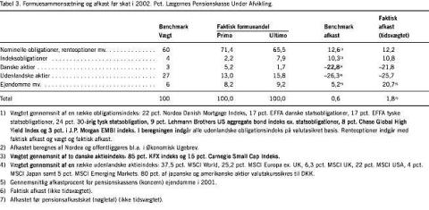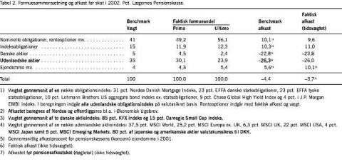 Årets formueafkast på -3,7 pct. (før skat) i Lægernes Pensionskasse er lidt bedre end kassens strategiske benchmarkafkast, jf. Tabel 2 . I forhold til benchmarkafkastet har det bidraget positivt til årets resultat, at pensionskassen i 2002 har haft en lavere aktieandel end den tilsigtede andel på 40 pct., og at afkastet på indeksobligationer og ejendomme har været bedre end benchmarkafkastet. Dette opvejer, at obligationsafkastet er lavere end benchmarkafkastet.