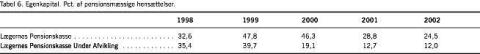 Egenkapitalen er relativt større i Lægernes Pensionskasse end i Lægernes Pensionskasse Under Afvikling, og i begge pensionskasser er egenkapitalen faldet fra 2001 til 2002 (Tabel 6 ).