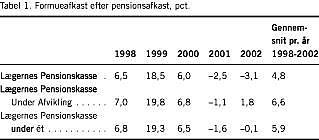 Lægernes Pensionskasse og Lægernes Pensionskasse Under Afvikling opnåede i 2002 tilsammen et formueafkast på -0,1 pct. efter skat og er således påvirket af årets kraftige kursfald på aktiemarkederne. Formueafkastet har over 5-års perioden fra 1998 til 2002 i gennemsnit udgjort 5,9 pct. om året efter skat (Tabel 1 ).