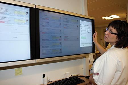 »Jeg var skeptisk, men i dag er jeg meget glad for skærmene. De giver et bedre overblik,« siger Maria Bach-Lakner, sygeplejerske og visitator. Hun tager telefonen, når der bliver ringet om nye patienter på vej til akutmodtagelsen. Opringningen kan komme fra en praktiserende læge, fra en ambulance eller fra hospitalets egen skadestue. Herefter taster hun patientens navn og cpr-nr. ind på skærmen - og et nyt behandlingsforløb er startet. På skærmen kan man nu følge det videre forløb: Når der er skrevet journal, når der har været en gennemgang, når blodprøver m.m. er bestilt. I et meddelelsesfelt kan læger og sygeplejersker skrive beskeder til hinanden om, hvad status er, eller hvad næste skridt skal være. En tæller viser, hvor lang tid der er gået, siden patienten ankom. Der står også helt kort, hvad symptomer eller diagnose er. De medicinske patienter er markeret med en blå farve, de kirurgiske patienter med en rød. Skærmene er trykfølsomme, så man med fingrene kan manøvrere rundt mellem patienterne. Med et enkelt tryk fremhæver man de enkelte patienter og kan via et tastatur skrive nye data ind.