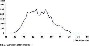 Blandt 4.074 overlæger i Overlægeforeningen er 1.371 eller 1/3 under 50 år (34 %). Halvdelen af alle overlæger (2.061) er mellem 50 og 60 år (51 %) og må forventes at nærme sig pensionering inden for en kortere årrække. Der er relativt få overlæger (642), som er over 60 år (15 %) (Fig. 1).