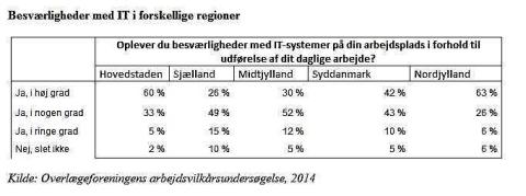 Værst ser det ud i Region Hovedstaden, hvor 93 pct. oplever it som et dagligt benspænd snarere end en hjælp. Men også i Nordjylland står det skidt til: Her er 89 pct. af overlægerne utilfredse med deres it.