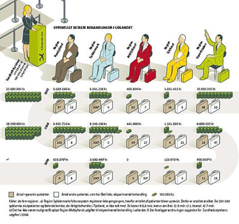 Tendensen er i stærk vækst internationalt, men belaster - indtil videre, da - ikke den danske samfundsøkonomi i større grad. Det er vanskeligt at få et samlet overblik over det danske sundhedsrejseri - f.eks. er det nogle gange, Sundhedsstyrelsen, der afholder udgifterne, mens det andre gange er regionerne. Men tal fra både regioner og styrelse viser, at skatteborgerne p.t. bruger 40-50 mio. kroner årligt på behandlinger i udlandet. Hertil kommer udgifter til transport, mad m.m., som i nogle tilfælde kan løbe op i stort set lige så meget som selve behandlingen.