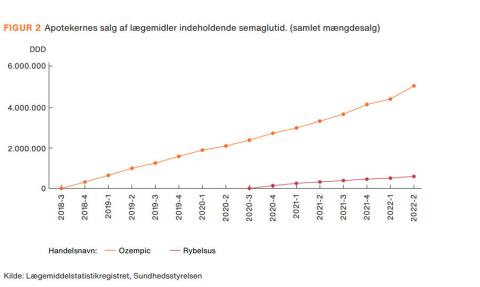 Tal fra Sundhedsdatastyrelsen viser, at salget af præparaterne Ozempic/Rybelsus er steget i primærsektoren i alle fem regioner i de seneste år. Begge lægemidler er glukagonlignende peptid (GLP)-1-analoger, indeholder semaglutid og giver øget mæthedsfornemmelse. I hele 2019 fik knap 58.000 personer et præparat med semaglutid. I de to første kvartaler af 2022 alene er tallet oppe på 120.000.