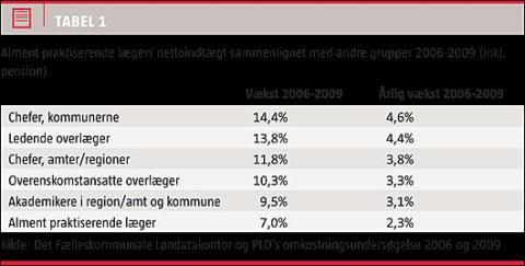 Ifølge en undersøgelse, som revisionsfirmaet Deloitte i august har foretaget for PLO, steg nettoindtægten for alment praktiserende læger fra 2006 til 2009 med 7 pct. I samme periode steg kommunale chefers løn med 14,4 pct. Ledende overlæger steg med 13,8 pct., mens de overenskomstansatte overlægers løn var steget med 10,3 pct.