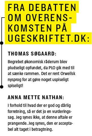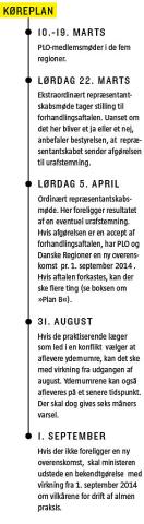 På lørdag den 22. marts skal PLO’s repræsentantskab mødes for at vurdere aftalen (se hovedpunkterne i boks). Aftalen »er ikke guld og grønne skove«, erkender PLO-formand Bruno Melgaard Jensen gerne. »Men vi har vurderet, at dette var en aftale, vi kunne gå ind for, og som kan give ro i sektoren. Den giver trods alt nogle muligheder i forhold til at komme videre«.