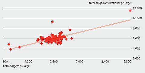 Jo flere borgere, der er tilknyttet den praktiserende læge, des flere konsultationer. Sådan tegner tendensen sig, men der er store afvigelser. Billedet er helt tydeligt, når det kommer til Læsø, Samsø og Ærø, hvor der er få patienter og få konsultationer. Til gengæld finder man også praksis med samme antal patienter, men hvor der er kæmpe udsving i antallet af konsultationer. Region Nordjylland peger på, at demografien og sygdomsmønstre er meget forskellige fra kommune til kommune. I nogle områder er det også lettere at få adgang til lægen end andre, og det spiller alt sammen ind på antallet af konsultationer.