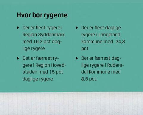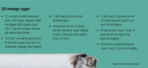Desuden har antallet af rygere ligget stabilt på ca. 17 pct. i de seneste fem år. Også antallet af storrygere, som ryger mere end 15 cigaretter om dagen, har ligget stabilt på på 7-9 pct. siden 2009 ifølge Danskernes Rygevaner 2015.