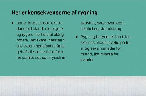 Ifølge en ny rapport om de største risikofaktorer i Danmark fra Sundhedsstyrelsen slår rygning og dens konsekvenser alle andre risikofaktorer med længder. Rapporten fastslår, at rygning hvert år er skyld i 13.600 dødsfald, selv når andre risikofaktorer som kost, alkohol og inaktivitet er fraregnet. Og samlet set slår rygning faktisk lige så mange ihjel årligt som de andre risikofaktorer tilsammen.