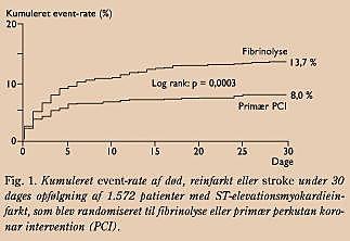 I DANAMI 2 bekræftes resultaterne af mere end 20 tidligere, mindre undersøgelser, at primær PCI er fibrinolyse overlegen, hvad angår den kombinerede risiko for død, et nyt myokardieinfarkt (reinfarkt) og stroke i efterforløbet. I DANAMI 2 reduceredes den kombinerede 30-dages-risiko med 42% (fra 13,7% til 8,0%) (Fig. 1 ) med størst effekt på risikoen for reinfarkt (75% relativ reduktion), mens risikoen for død og stroke reduceredes insignifikant. Foreløbige langtidsopgørelser viser, at gevinsten af primær PCI bibeholdes under 1-2 års opfølgning.