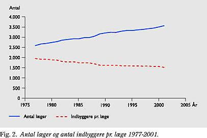 Antallet af læger er i perioden 1977 til 2001 steget med næsten 1.000 fra ca. 2.600 til ca. 3.550. Det har betydet, at antal indbyggere pr. læge er faldet fra ca. 1.950 til ca. 1.500 i perioden. Fig. 2 illustrerer dette forhold. Bemærk, at antal indbyggere pr. læge i 1990'erne har ligget stabilt omkring 1.550. Det er et udtryk for, at stigningstakten i antal praktiserende læger i 90'erne alene har fulgt med befolkningsudviklingen. Bemærk også, at der her er tale om læger og ikke klassificerede (»fuldtids«) læger. En klassificeret læge kan være delt mellem to læger på halv tid - de såkaldte delelæger. De sidste 3-5 år er antallet af delelæger vokset markant. (Antallet ligger nu på et niveau omkring 150 klassificerede delelæger, svarende til mindst 300 læger.