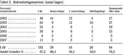 Rekrutteringsreserven er på denne baggrund estimeret til i alt 192 læger. Det forventede nedsættelsesår fordelt efter ansættelsesforhold og køn fremgår af Tabel 3 .